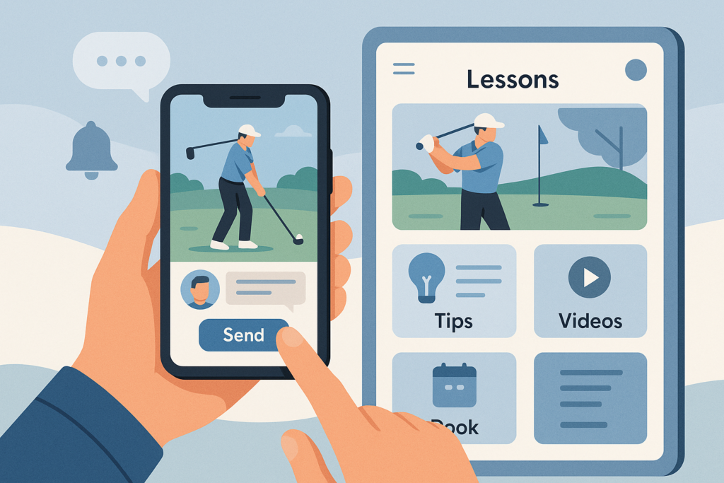 The mobile app offers a seamless experience for uploading swing videos, receiving real-time expert feedback, booking remote classes, and diving into a rich library of tips, tutorials, and coaching materials.